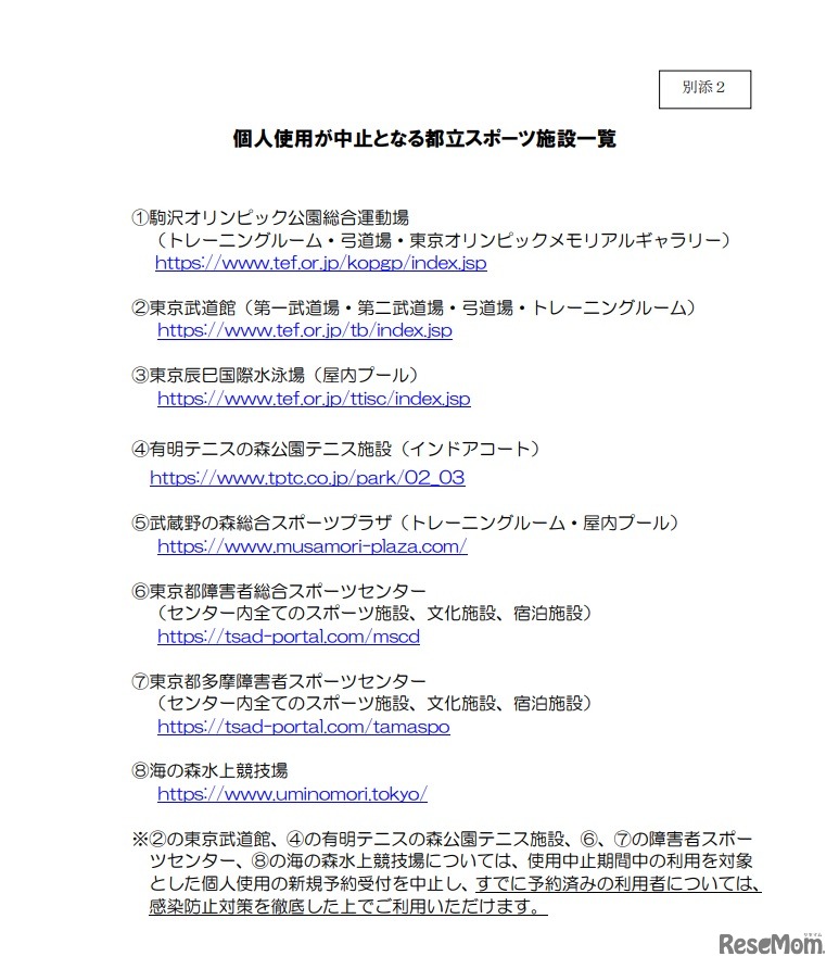 画像出典:東京都 個人使用が中止となる都立スポーツ施設一覧