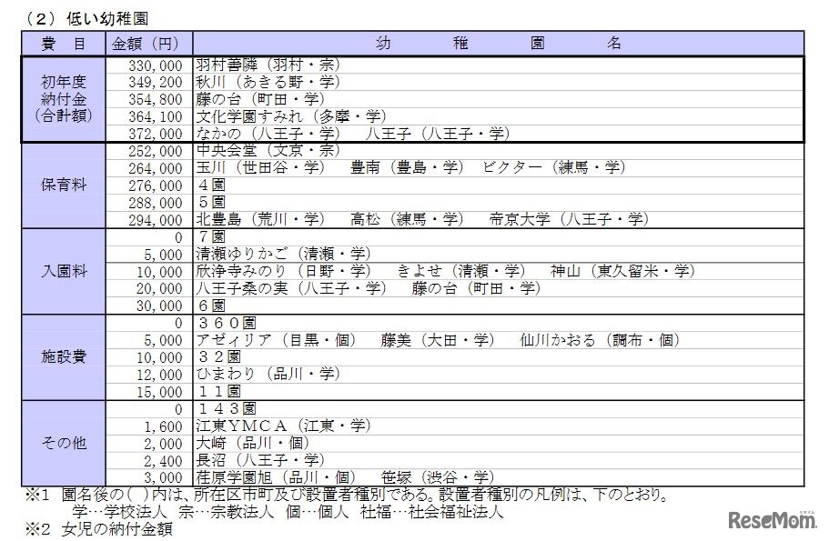 画像出典:東京都 初年度納付金額(費目別)の低い幼稚園