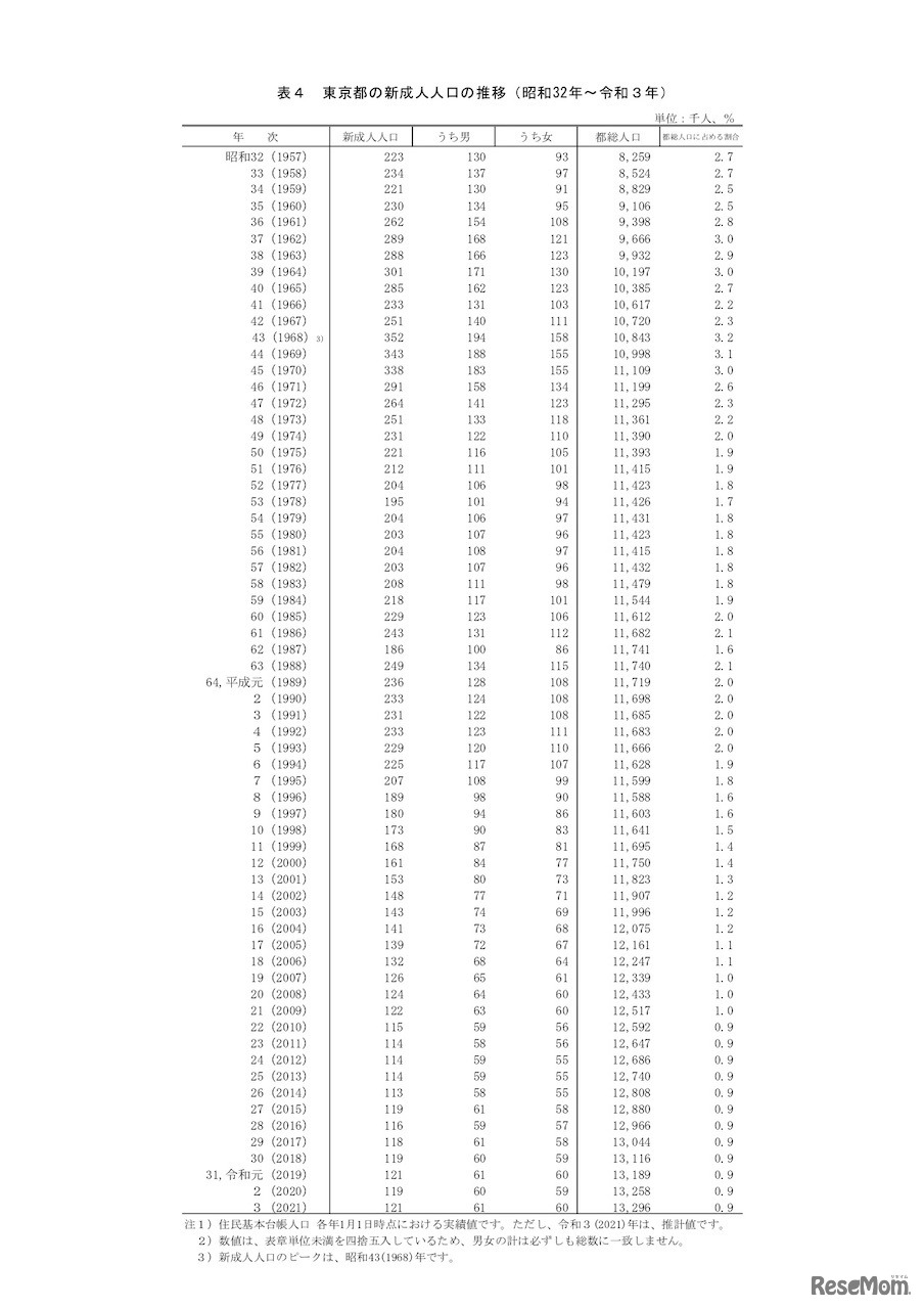 画像出典:東京都 東京都の新成人人口の推移(1957年~2021年)
