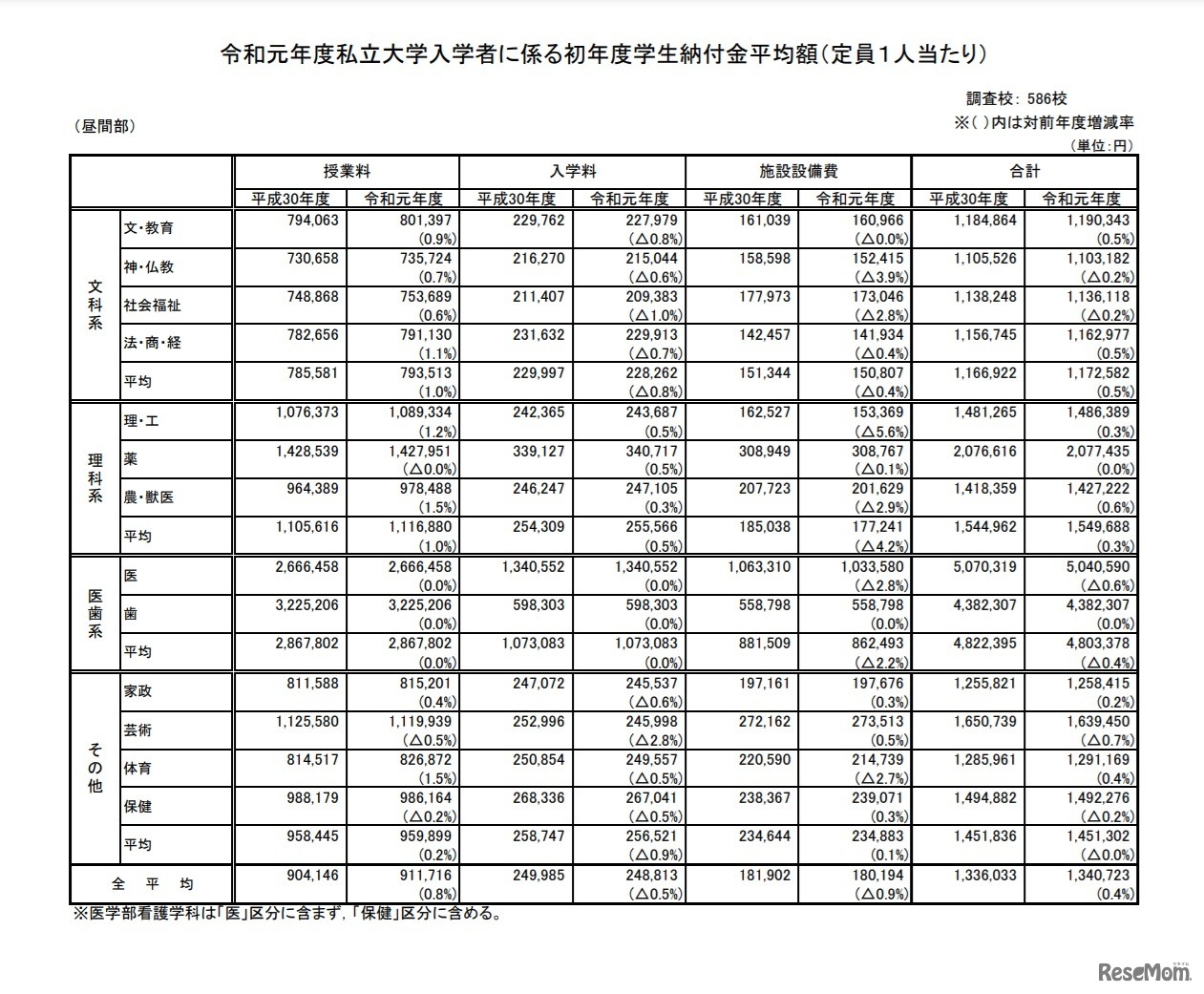 文部科学省は2020年12月25日、私立大学等の令和元年度(2019年度)入学者に係る学生納付金等調査結果を公表した。2019年度の私立大学(学部)の初年度学生納付金は、前年度(2018年度)より0.4%増となる134万723円だった。