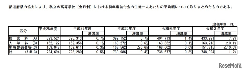 文部科学省は2020年12月25日、2020年度(令和2年度)の私立の幼稚園・小学校・中学校・高校(全日制)の授業料等調査結果を公表した。私立高校(全日制)の初年度納付金の平均額は74万8,924円で、都道府県別にみると神奈川県がもっとも高かった。