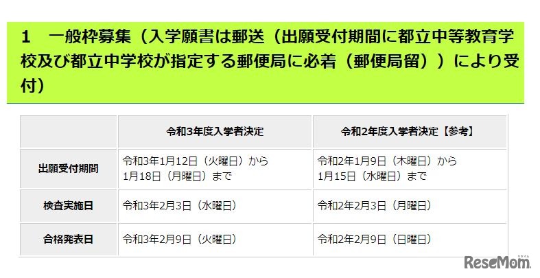東京都教育委員会は2020年12月25日、2021年度(令和3年度)都立中等教育学校および都立中学校の入学者決定は、新型コロナウイルス感染症を含めたインフルエンザなど学校感染症罹患者等に対する追検査は実施しないことを公表した。