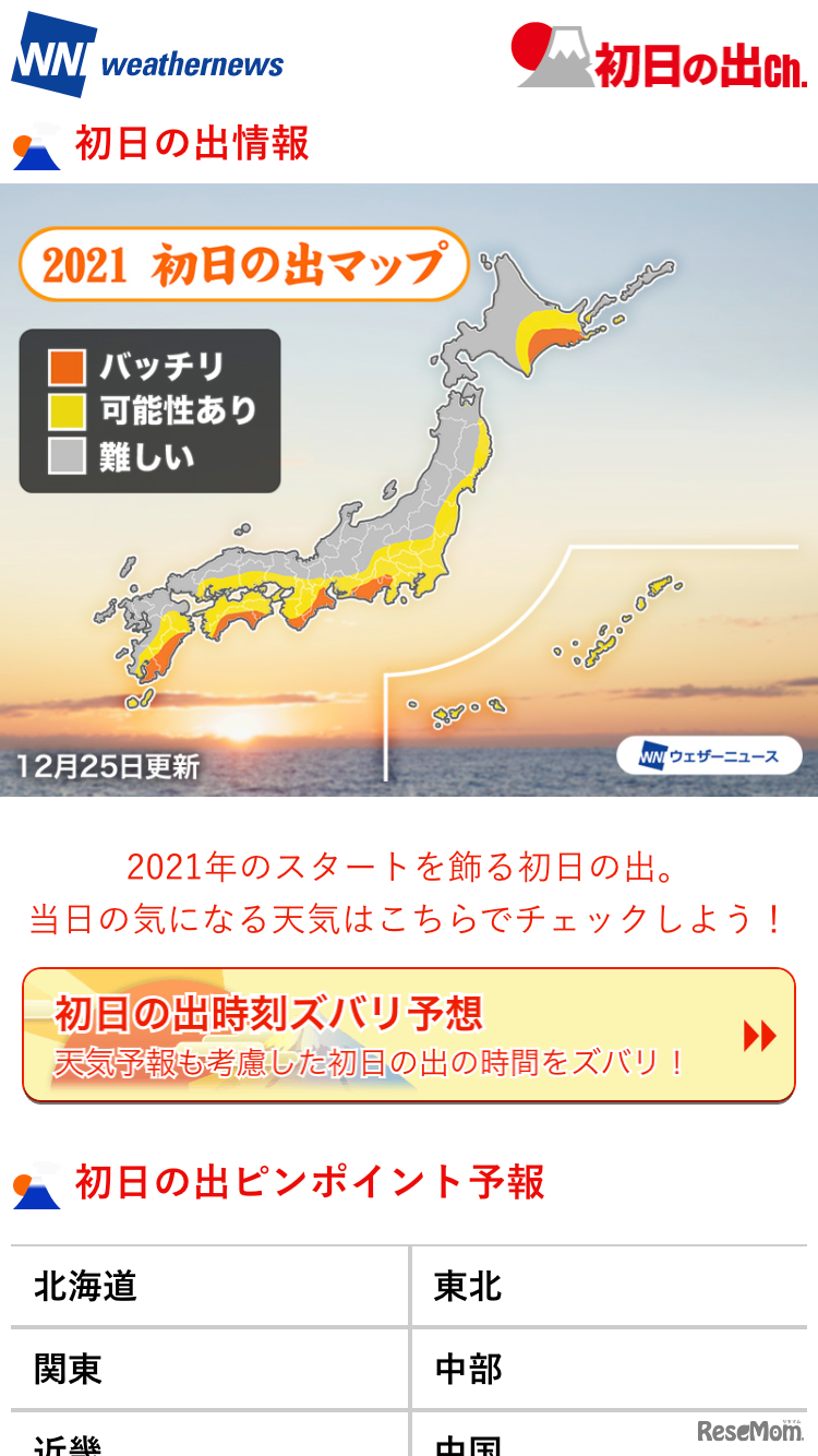 ウェザーニューズは、ウェザーニュースアプリおよびWebサイトの「初日の出Ch.」にて、2021年元旦の天気見解と「2021初日の出マップ」を公開。また、2020年12月31日正午より、初日の出の見える時刻を分単位で予測するサービス「初日の出時刻ズバリ予想」を提供する。