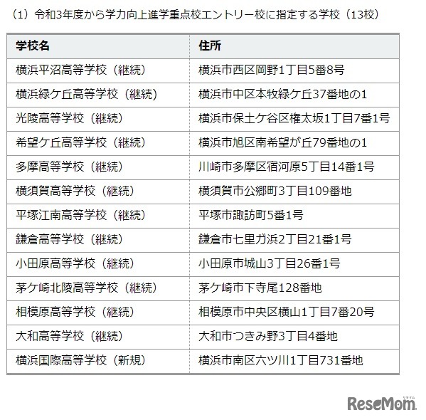 神奈川県教育委員会は2020年12月23日、2021年度(令和3年度)以降の「学力向上進学重点校」について、新たに川和高等学校を加えた5校を指定することを公表した。また、横浜平沼高校など13の県立高校が「学力向上進学重点校エントリー校」として指定を受けた。