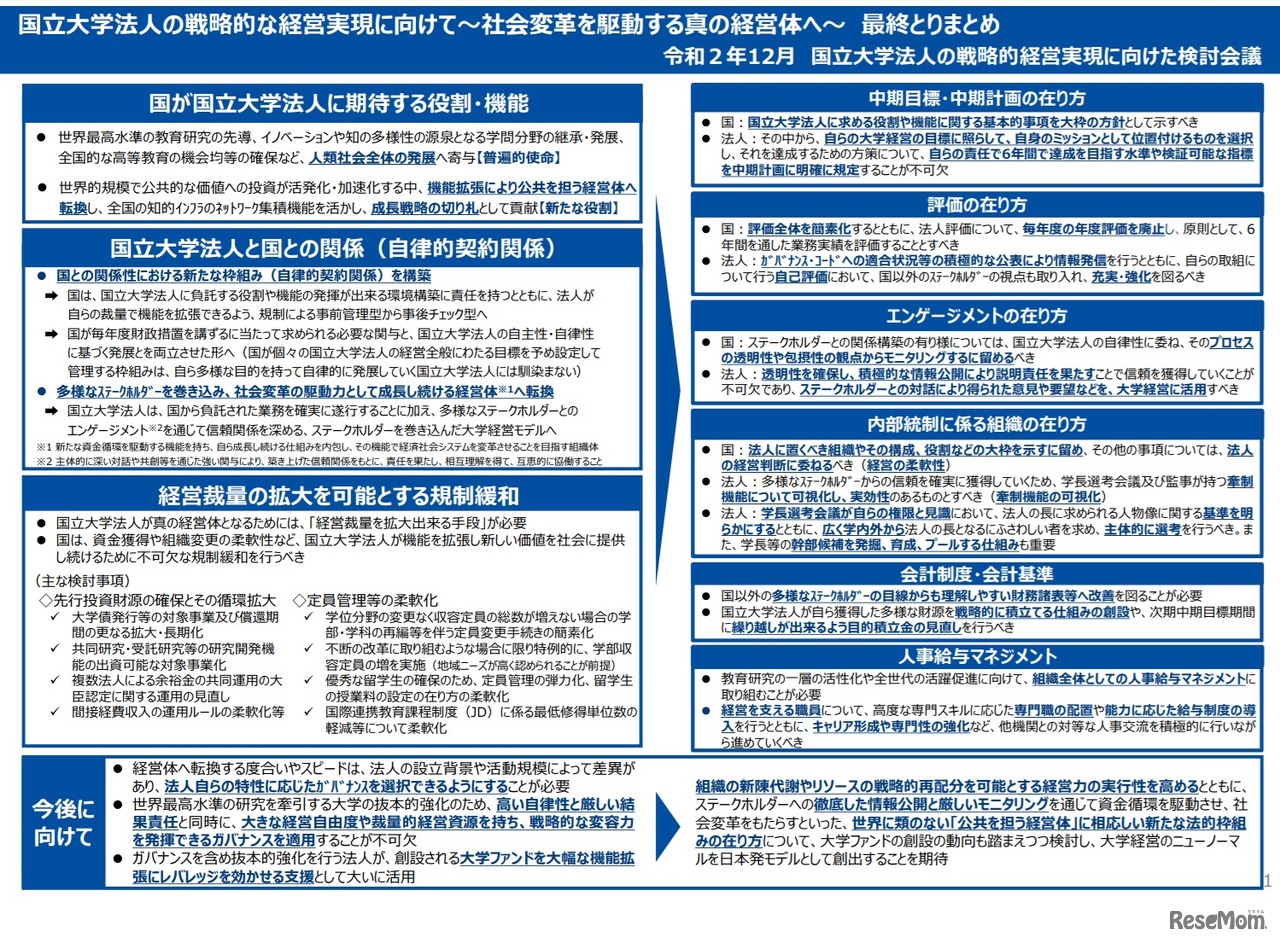 文部科学省は2020年12月25日、国立大学法人の戦略的経営実現に向けた検討会議において、「国立大学法人の戦略的な経営実現に向けて~社会変革を駆動する真の経営体へ~」として検討結果(最終とりまとめ)を公表した。
