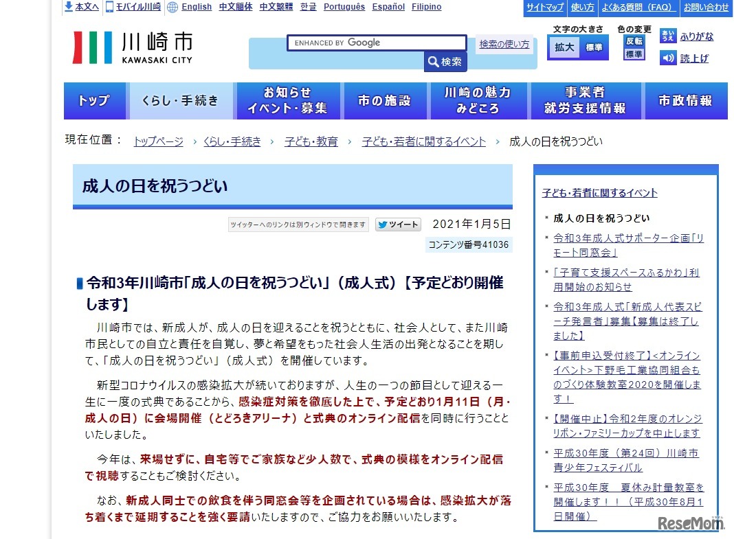 政府は首都圏1都3県に緊急事態宣言の発令を2021年1月7日に決定するが、成人式開催を1月11日に控える自治体では対応に追われている。横浜市は2会場で各4回に分けて実施、千葉市では式典を中止し事前収録した動画を公開する。