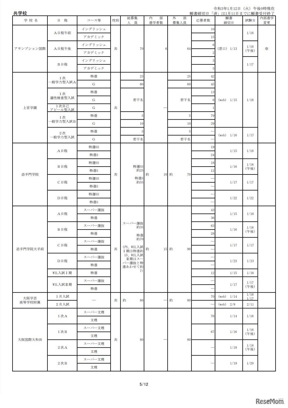 2021年度大阪私立中学校生徒応募状況一覧(2021年1月12日午後0時現在、一部)