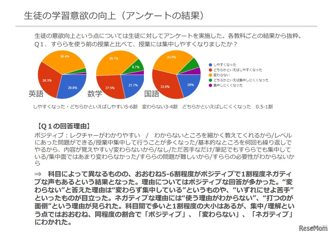 未来の教室「AI教材すららの公立学校教育への導入」資料より 生徒に対してのアンケートでは、5~6割が「授業に集中しやすくなった」とポジティブな回答