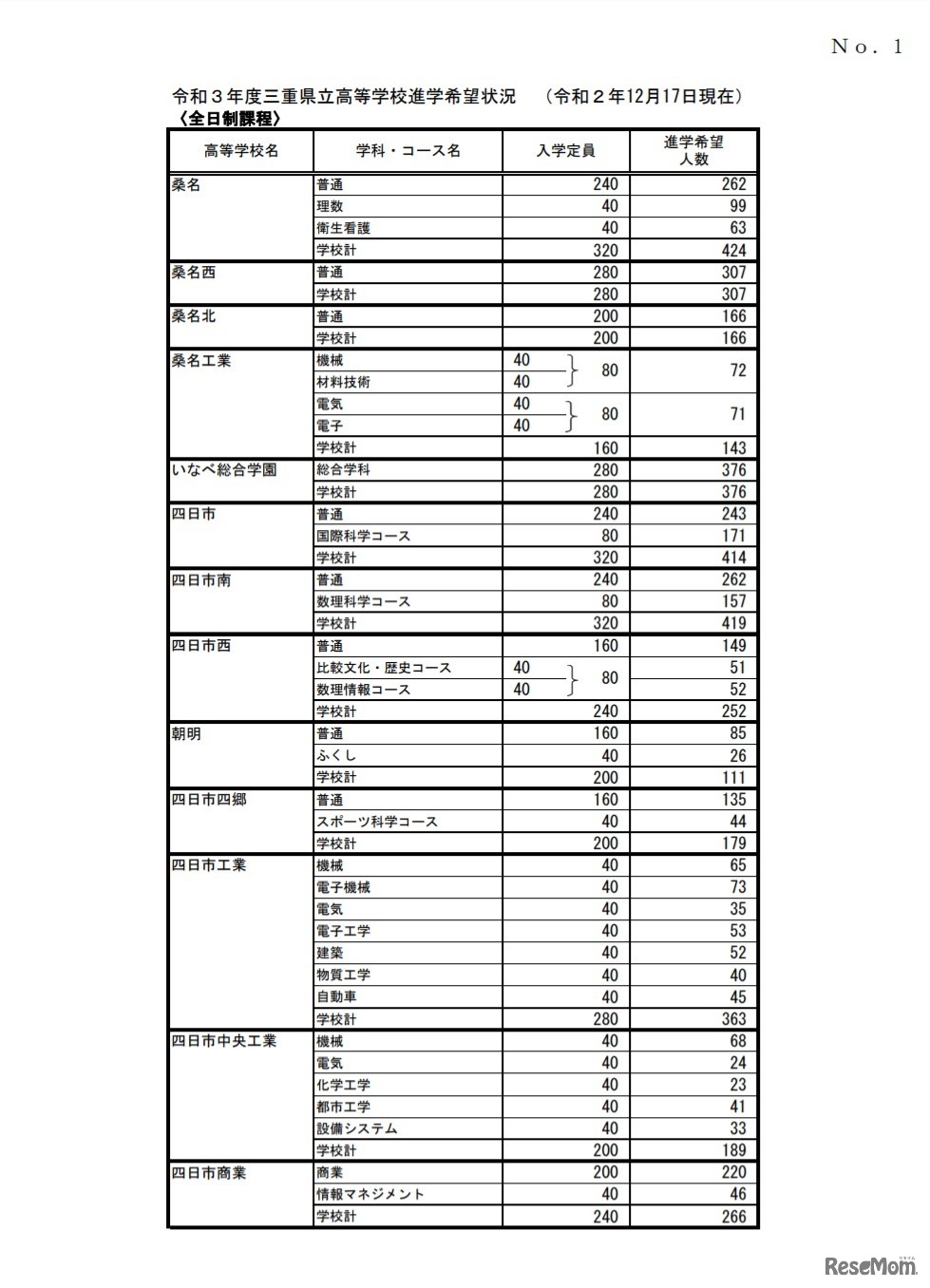 三重県教育委員会は2021年1月15日、2021年度(令和3年度)三重県立高等学校進学希望状況を公表した。県内中学校卒業予定者のうち、全日制課程進学希望者は1万1,166人。各校の希望倍率は、四日市(普通)1.01倍、四日市(国際科学)2.14倍、桑名(理数)2.48倍など。