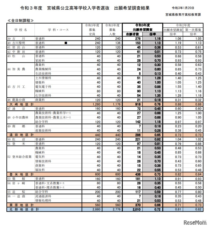 宮城県教育庁は2021年1月20日、2021年度(令和3年度)宮城県公立高等学校入学者選抜における出願希望調査について発表した。全日制課程は募集定員1万4,200人に対して1万3,677人が志願し、志願倍率は0.96倍。