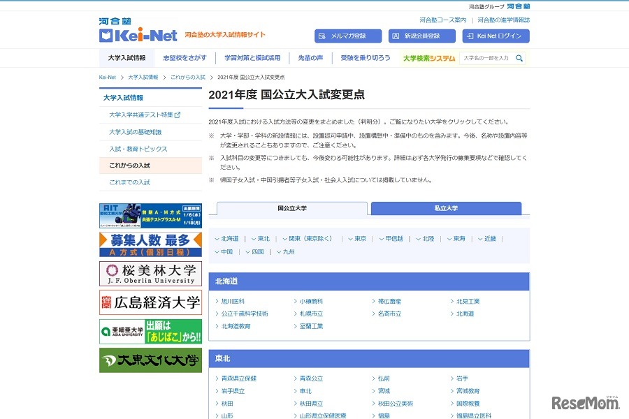 河合塾の大学入試情報サイトKei-Netは2021年1月26日、2021年度入試情報の「新型コロナウイルス感染症への各大学の対応」「2021年度 国公立大入試変更点」「私立大出願状況リンク集」を更新した。