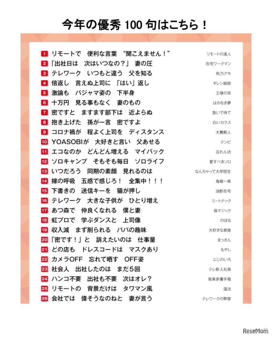 第一生命保険は2021年1月27日、第34回「第一生命サラリーマン川柳コンクール」の優秀100句を発表した。「テレワーク」「体調管理」「マスク着用」などwithコロナ時代のサラリーマンの姿がユニークに表現されている。ベスト10に進む作品の投票受付は3月19日まで。