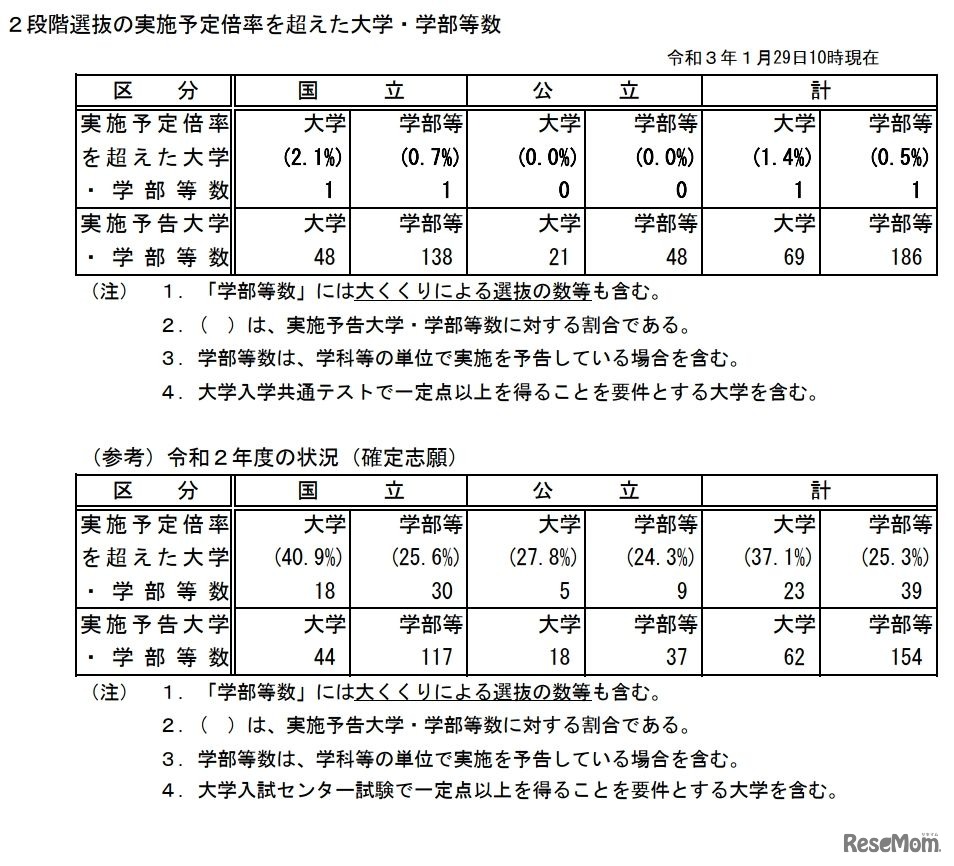 2段階選抜の実施予定倍率を超えた大学・学部等数