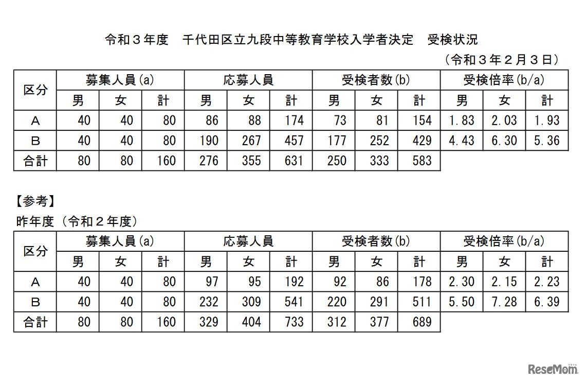画像出典:千代田区立九段中等教育学校 令和3年度千代田区立九段中等教育学校入学者決定受検状況