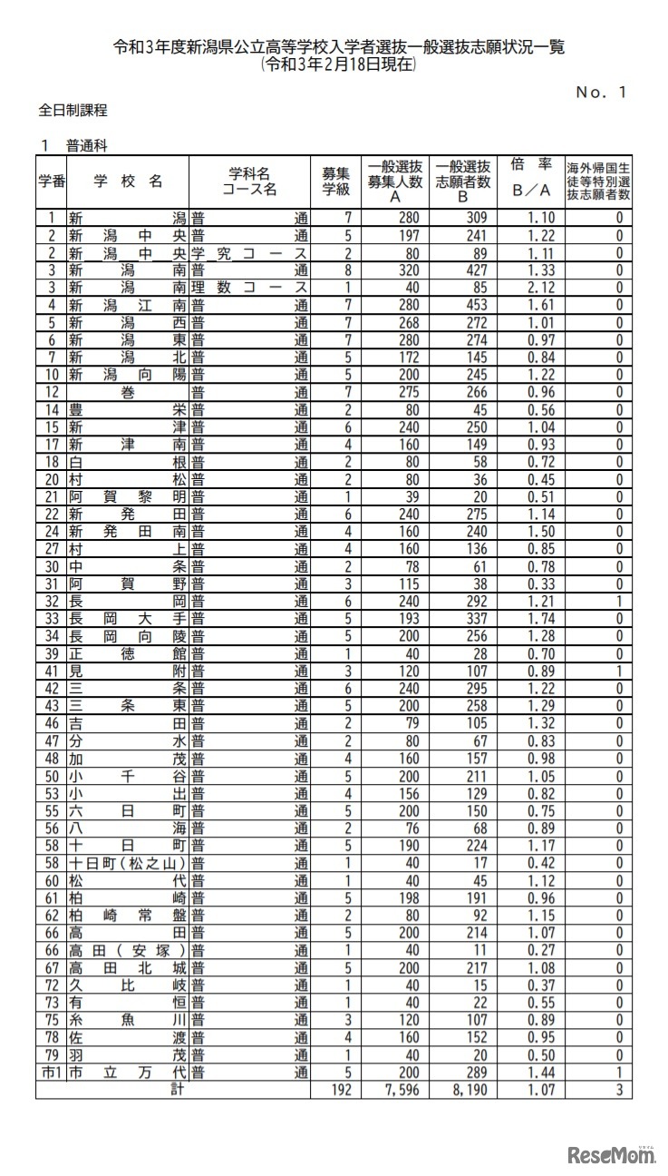 画像出典:新潟県 令和3年度新潟県公立高等学校入学者選抜一般選抜志願状況一覧(令和3年2月18日現在)(全日制)