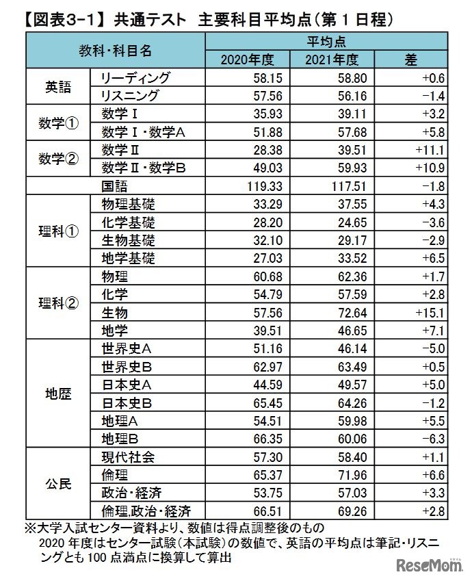 画像出典:河合塾 共通テスト 主要科目平均点(第1日程) (c) Kawaijuku Educational Institution.