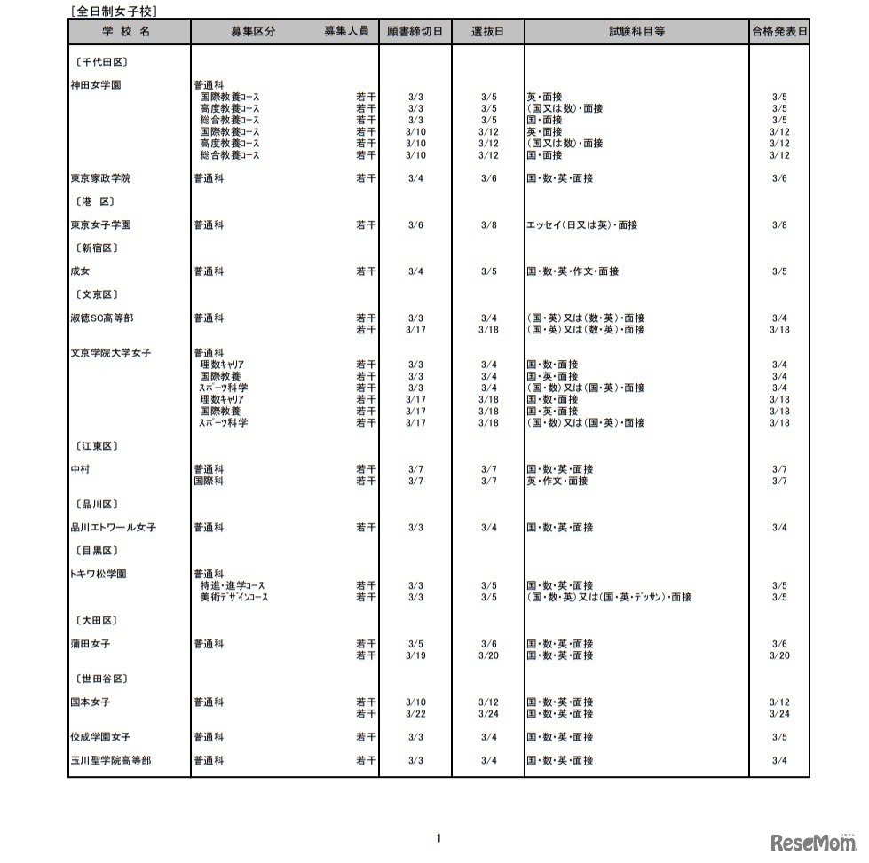 画像出典:東京都生活文化局 令和3年度都内私立高等学校第2次募集校一覧(第2回)全日制女子校