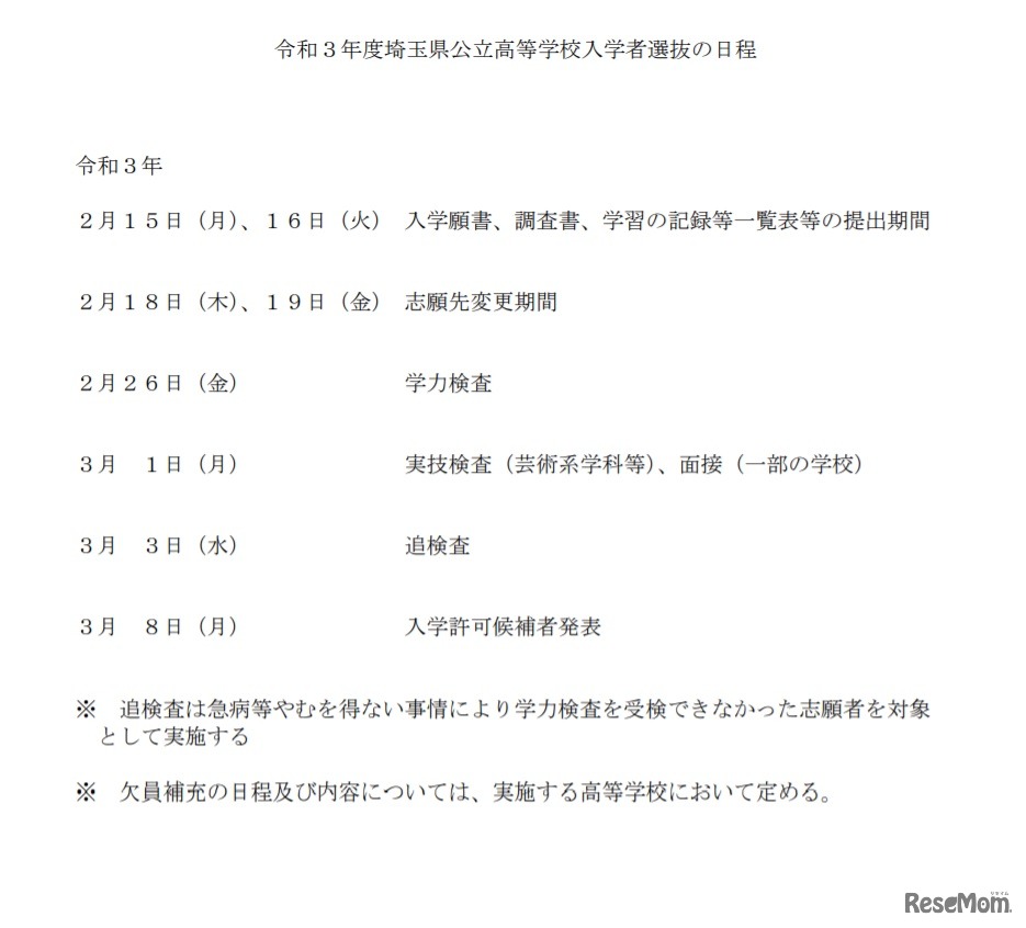 令和3年度埼玉県公立高等学校入学者選抜の日程