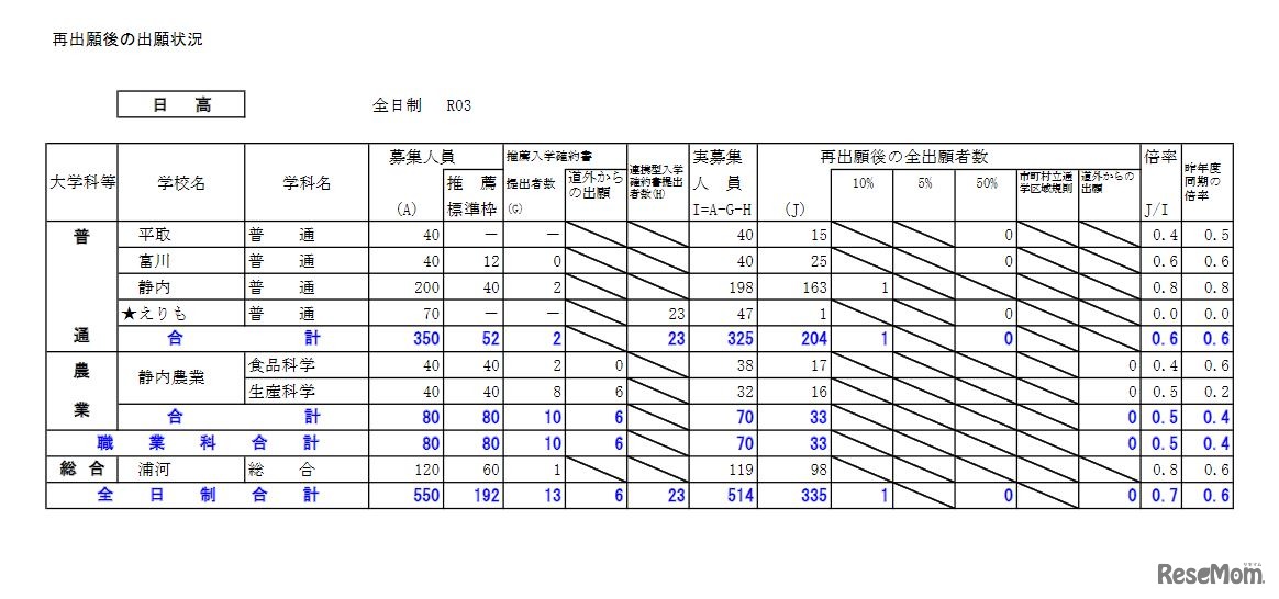 画像出典:北海道教育委員会 再出願後の出願状況(日高)