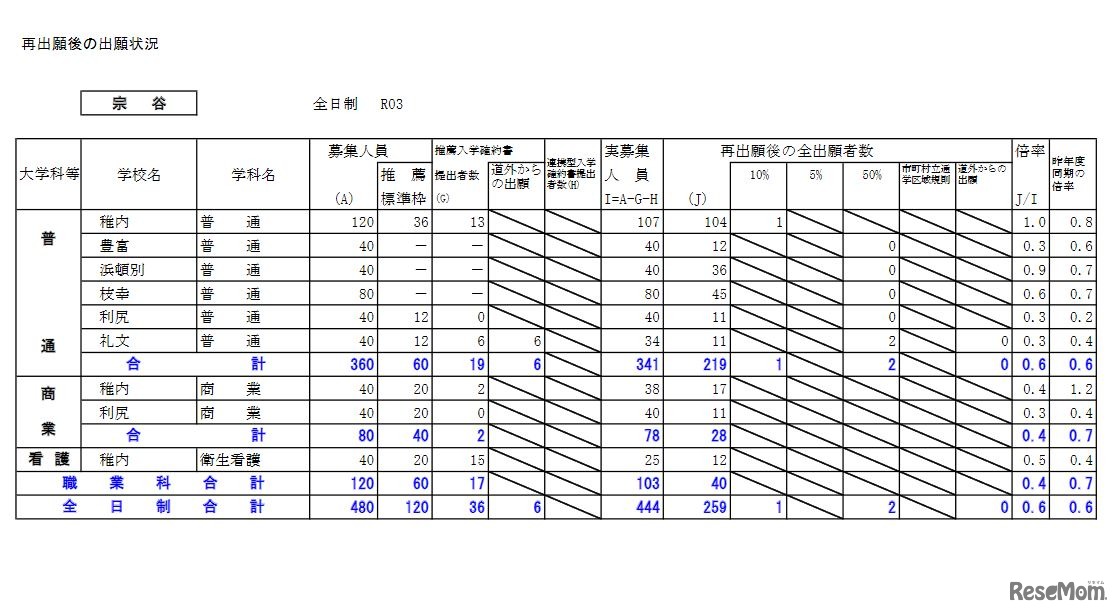 画像出典:北海道教育委員会 再出願後の出願状況(宗谷)