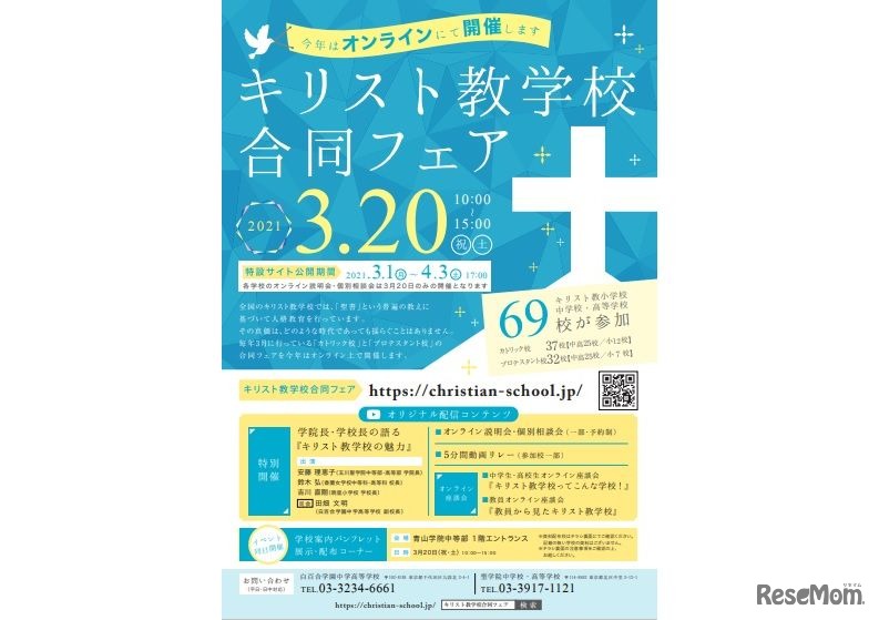 全国の「カトリック学校」と「プロテスタント学校」が、9回目となる「キリスト教学校合同フェア」を2021年3月20日にオンライン開催する。また、学校案内パンフレットの展示・配布コーナーを、青山学院中等部にて同日設ける。