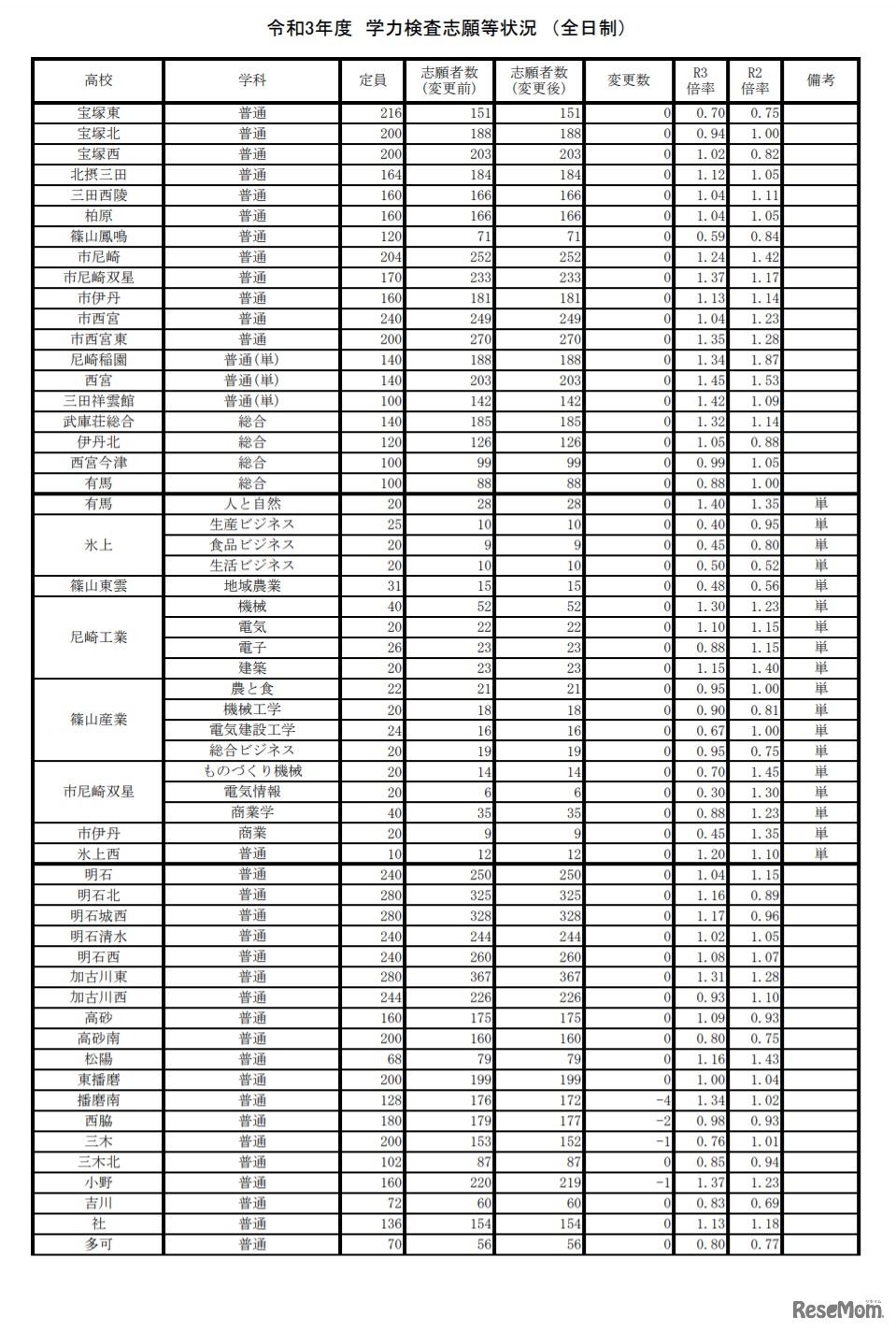 画像出典:兵庫県教育委員会 令和3年度 学力検査志願等状況(全日制・2021年3月1日正午時点)