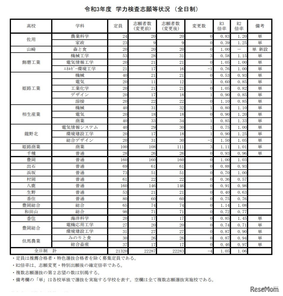 兵庫県教育委員会は2021年3月1日、2021年度(令和3年度)兵庫県公立高等学校入学者選抜について、全日制出願変更初日の3月1日正午時点における出願状況を公表した。3月1日正午時点で、全日制の志願者数は2万2,283人。