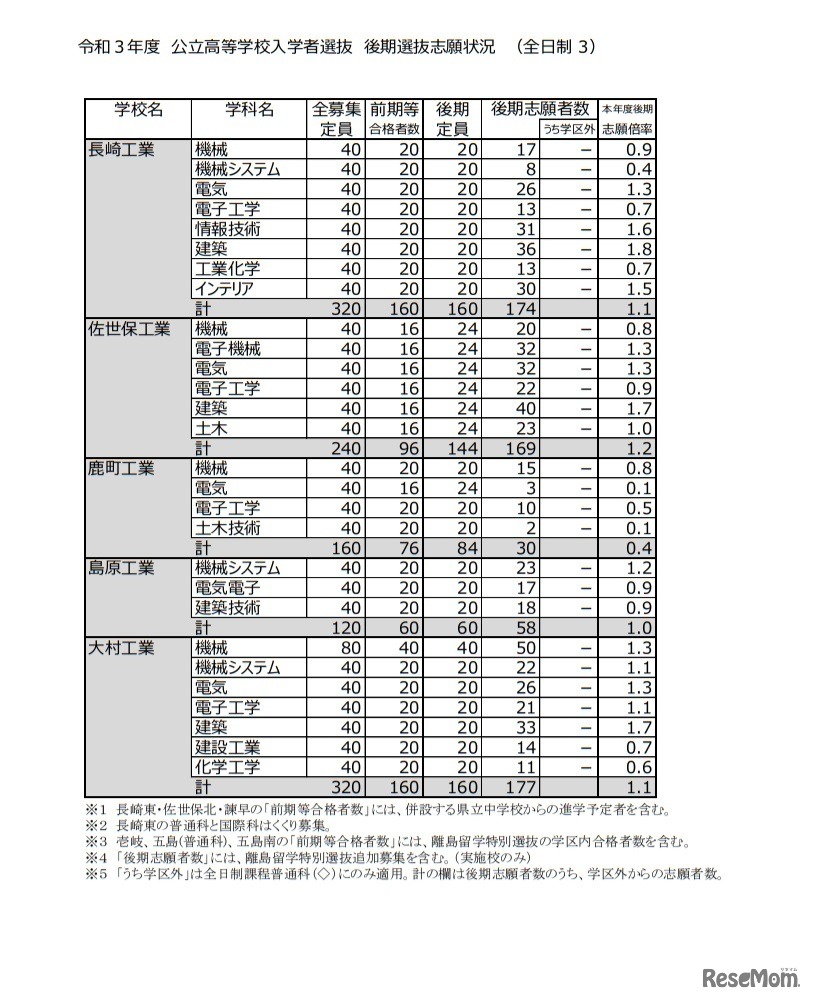 長崎県教育委員会は2021年2月27日、令和3年度(2021年度)公立高等学校入学者選抜における後期選抜の確定志願状況を公表した。全日制は4,350人が志願し、志願倍率は0.79倍。各学校の志願倍率は、長崎西(普通)0.8倍、長崎西(普通・理系)1.8倍など。