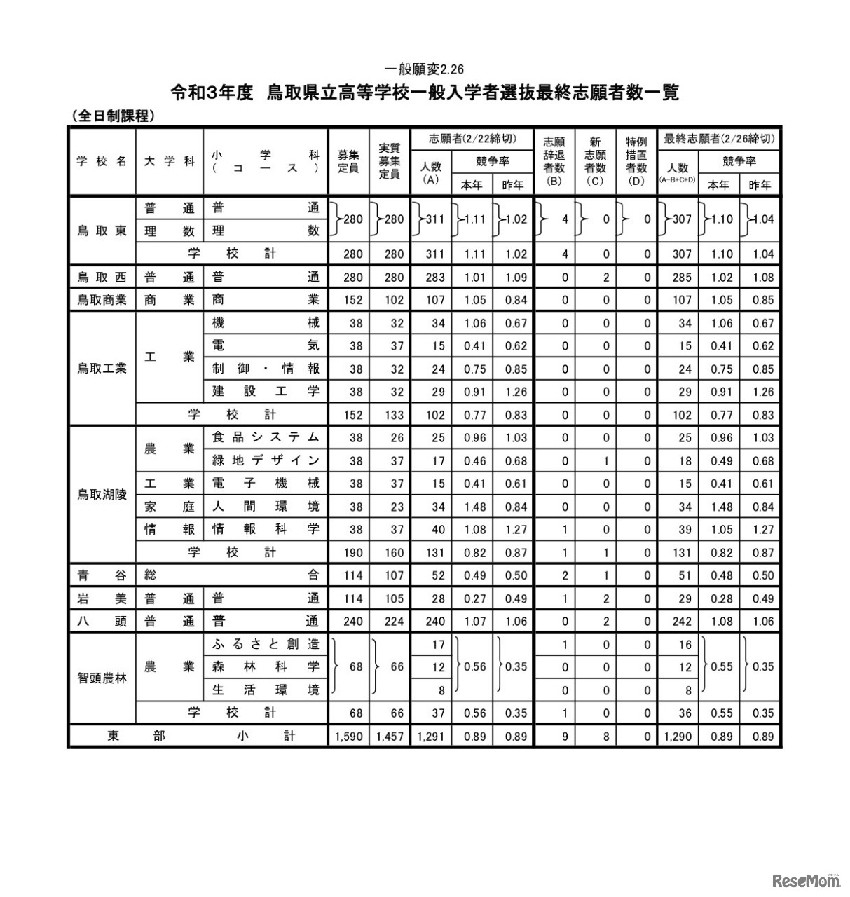 鳥取県教育委員会は2021年2月26日、2021年度(令和3年度)鳥取県立高等学校一般入学者選抜最終志願状況(確定)を公表した。一般選抜の実質募集定員3,419人に対し志願者数は3,194人で、競争率(倍率)は0.93倍。志願変更による志願者数の増減はなかった。