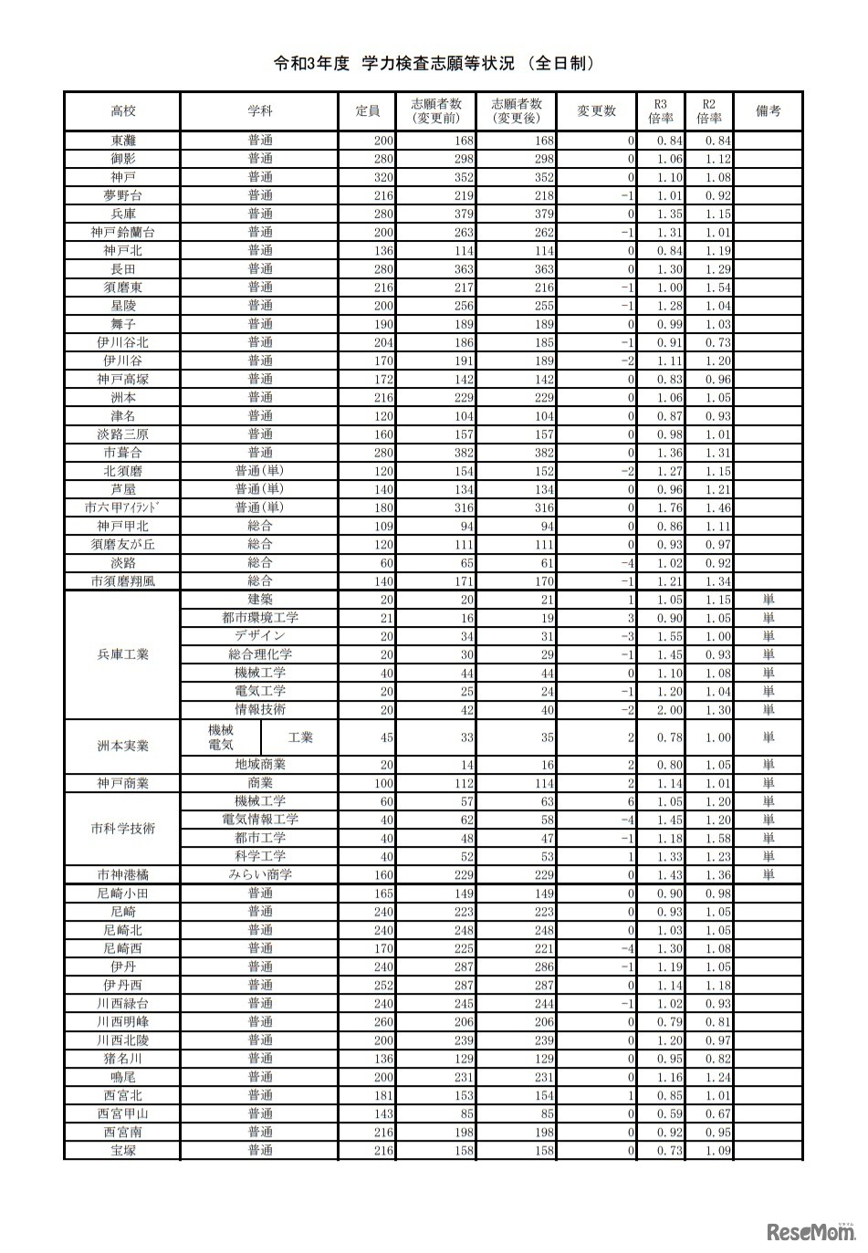 兵庫県教育委員会は2021年3月2日、令和3年度(2021年度)兵庫県公立高等学校入学者選抜について、全日制出願変更2日目の3月2日正午時点における出願状況を公表した。3月2日正午現在、全日制の志願者数は2万2,271人で、倍率は1.04倍。