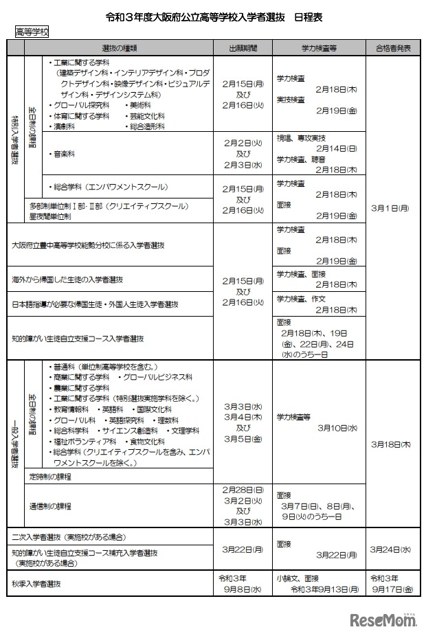 2021年度大阪府公立高等学校入学者選抜 日程表