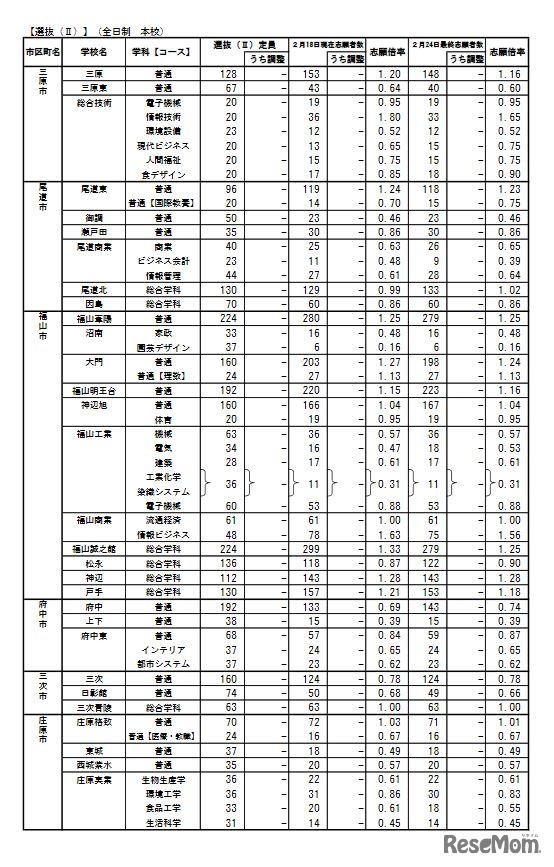 令和3年度 広島県公立高等学校選抜(II)の志願状況