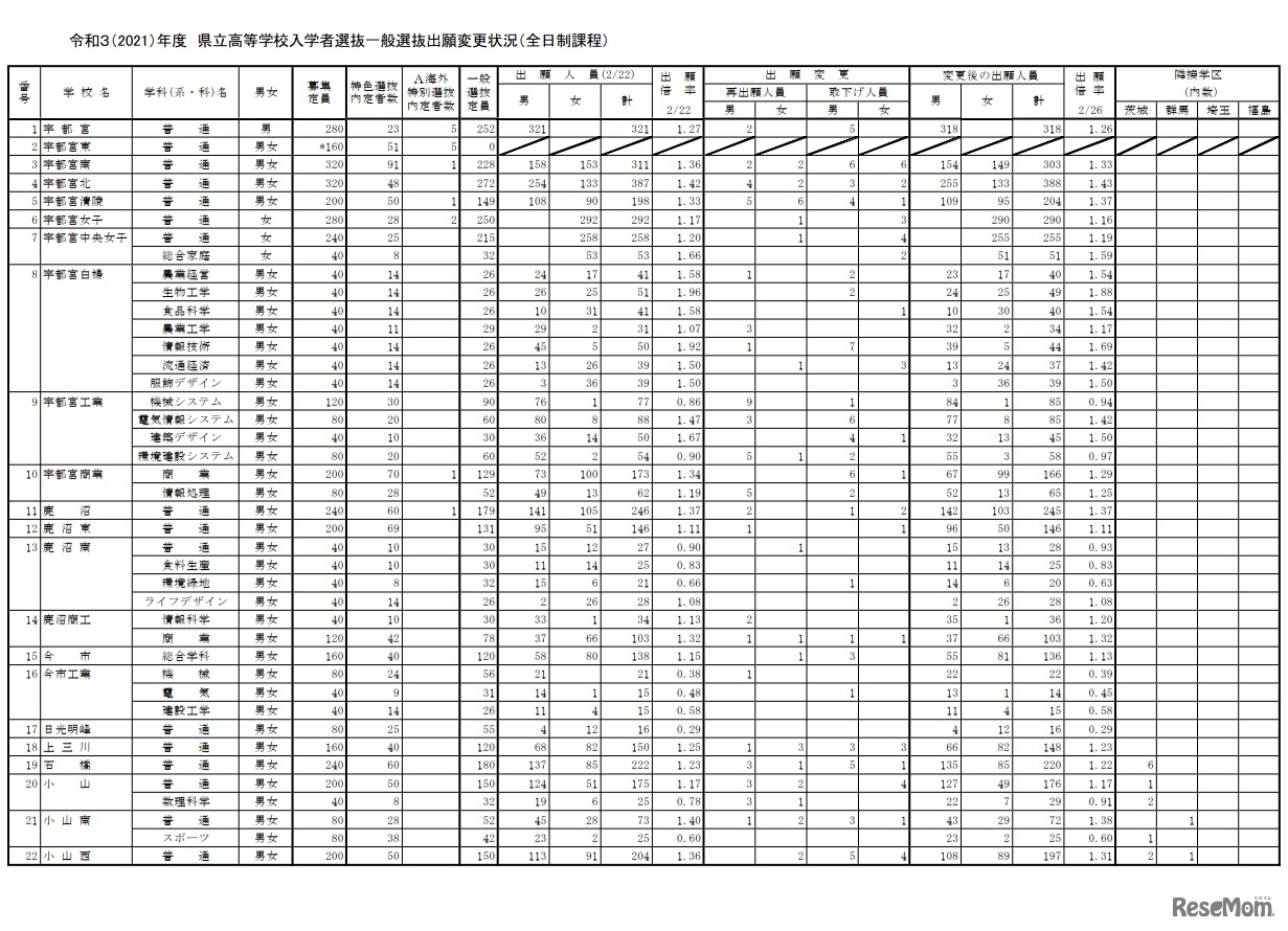 令和3(2021)年度 栃木県立高等学校入学者選抜一般選抜出願変更状況(全日制課程)