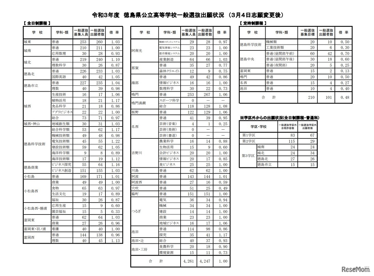 徳島県教育委員会は2021年3月4日、2021年度(令和3年度)徳島県公立高等学校一般選抜の確定出願状況を公開した。全日制の課程は、一般選抜募集人員4,261人に対し4,247人が志願し、志願倍率は1.00倍。