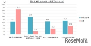 コロナ禍における学校の対応を調査したところ、日本の学校の8割以上が「紙教材による宿題の提示」を行い、「オンライン授業」実施は11か国中最下位であることが、スプリックス基礎学力研究所の調査で明らかになった。