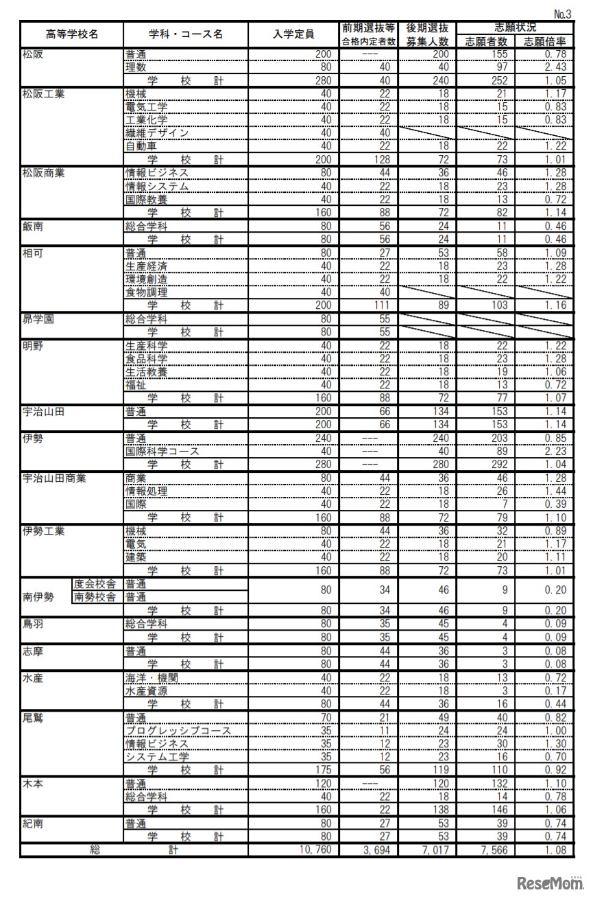 三重県教育委員会は2021年3月6日、2021年度(令和3年度)三重県立高等学校後期選抜志願状況(最終)を公表した。全日制は、募集人数7,017人に対し、志願者数は7,566人、志願倍率は1.08倍。学校別の志願倍率は、桑名(理数)3.03倍、四日市(国際科学コース)2.41倍など。