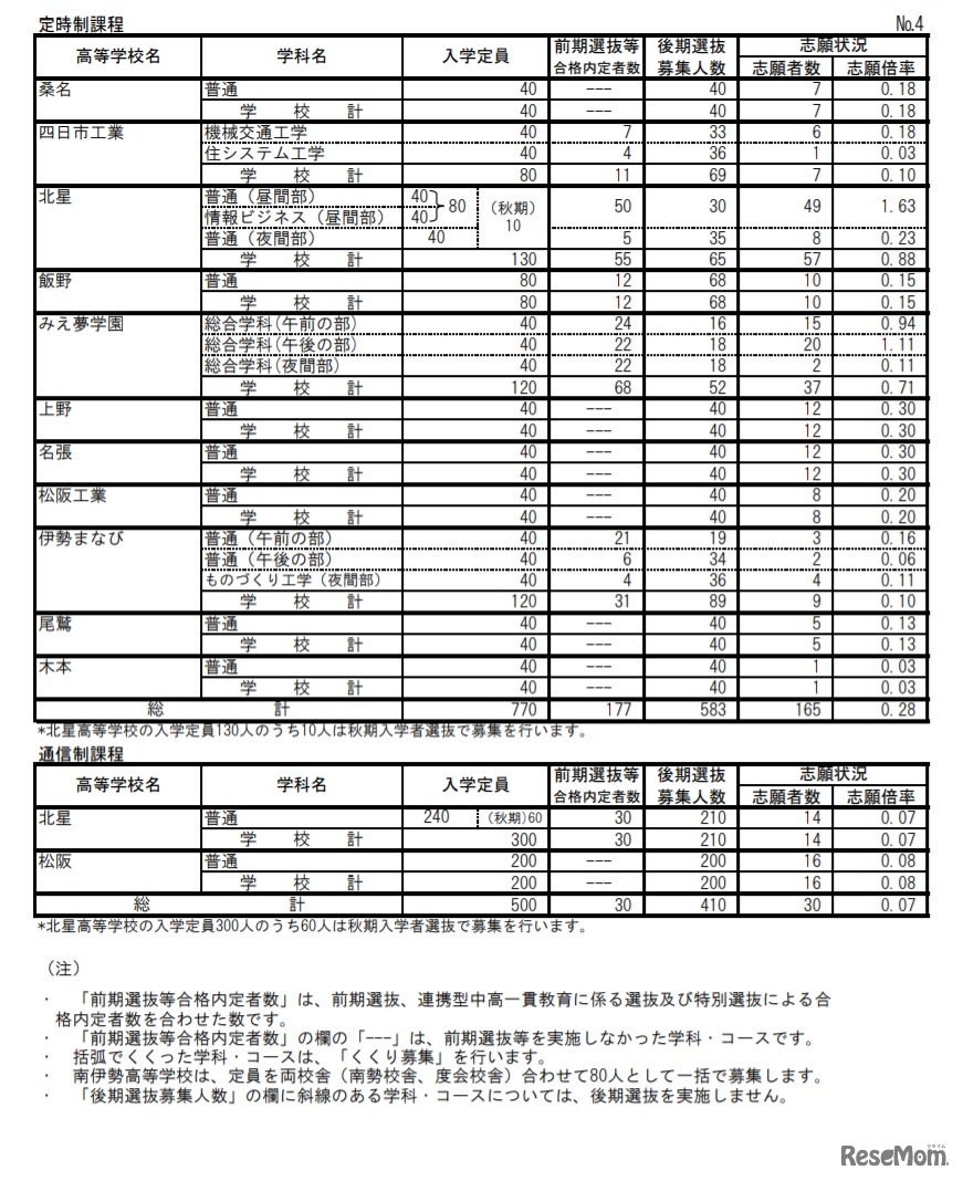 令和3年度三重県立高等学校後期選抜志願状況(最終)定時制課程・通信制課程