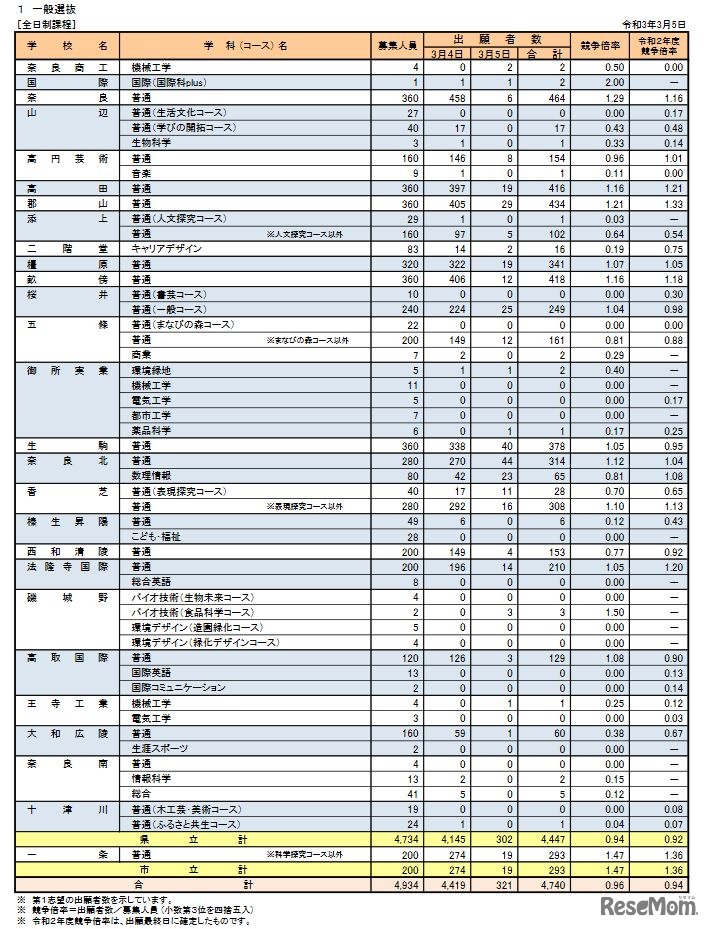 奈良県教育委員会は2021年3月5日、2021年度(令和3年度)の奈良県公立高等学校入学者一般選抜について、出願受付締切後の確定出願状況・倍率を発表した。全日制合計の募集人員4,934人に対し、出願者数は4,740人で、競争倍率は0.96倍となった。