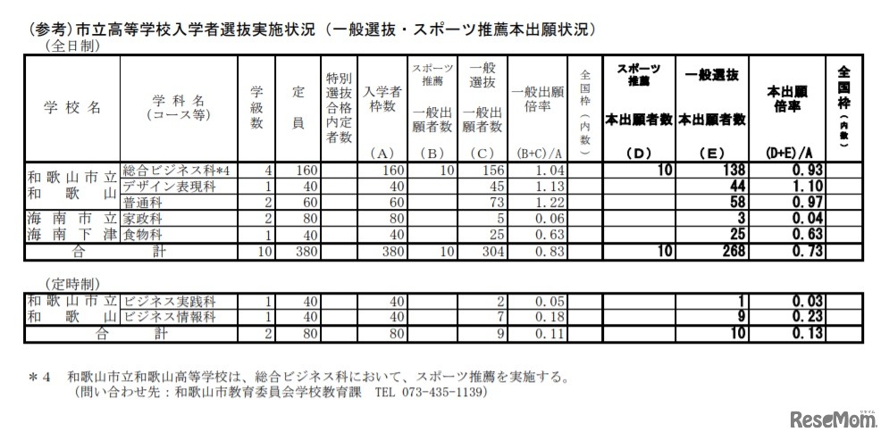 画像出典:和歌山県教育委員会 市立高等学校入学者選抜実施状況(一般選抜・スポーツ推薦本出願状況)
