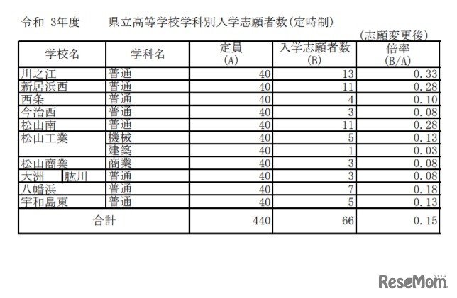 愛媛県教育委員会は2021年3月4日、2021年度(令和3年度)愛媛県立高等学校入学者選抜の志願状況(志願変更後)を発表した。学校・学科別の志願倍率は、松山東(普通)1.08倍、今治西本校(普通)0.90倍、松山南本校(普通)1.08倍など。