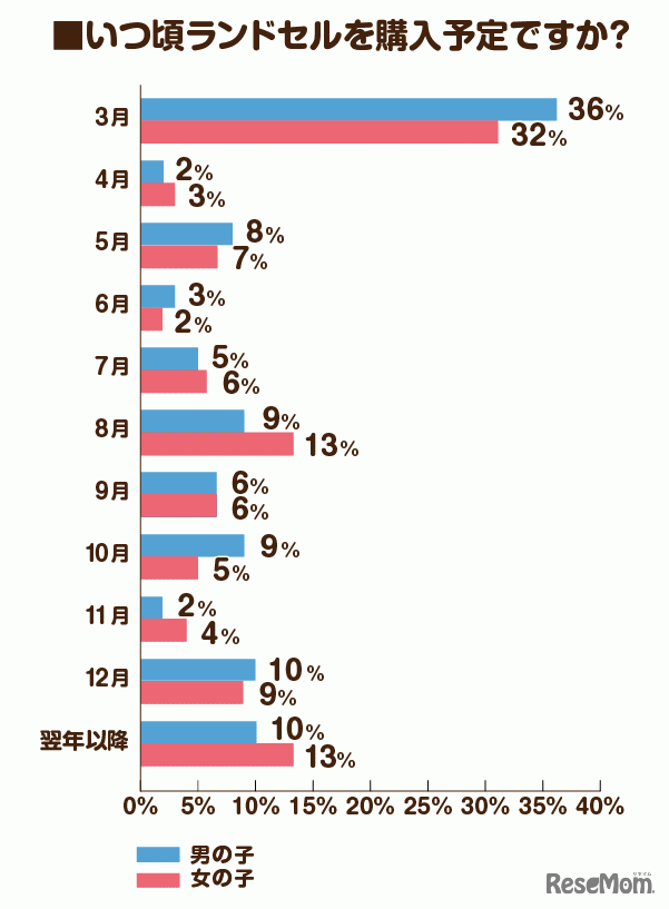 2022年4月に小学校に入学する子どもがいる家庭のランドセル購入予定時期は、「3月」が最多であることが「ランドセルの通知表」が発表した調査結果より明らかになった。購入の際に重視するポイントは、男の子が「耐久性」、女の子が「デザイン・色」であった。