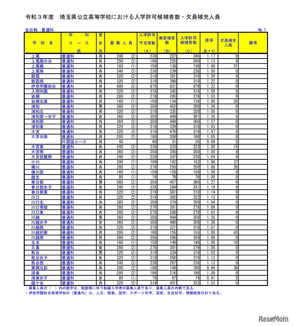 埼玉県教育委員会は2021年3月8日、令和3年度(2021年度)埼玉県公立高等学校入学者選抜について入学許可候補者数および欠員補充人員を公表した。全日制全体の入学許可候補者は3万4,680人、欠員補充人員は1,458人だった。