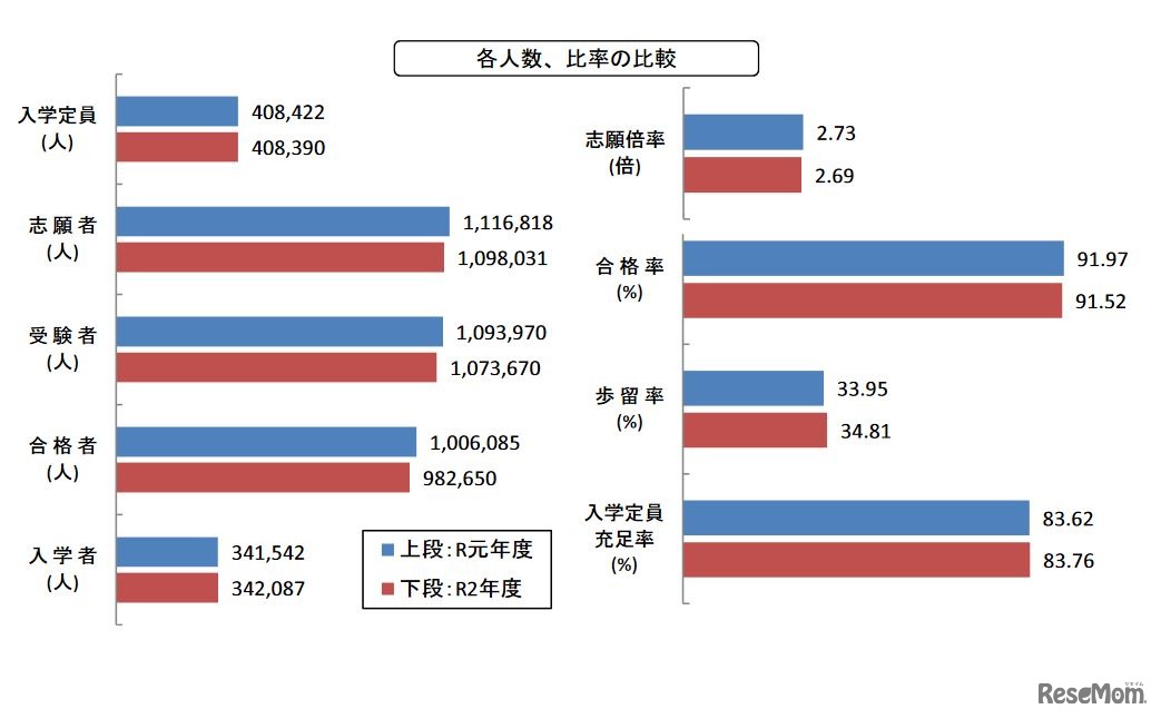 画像出典:日本私立学校振興・共済事業団「令和2(2020)年度私立高等学校入学志願動向」 各人数、比率の比較
