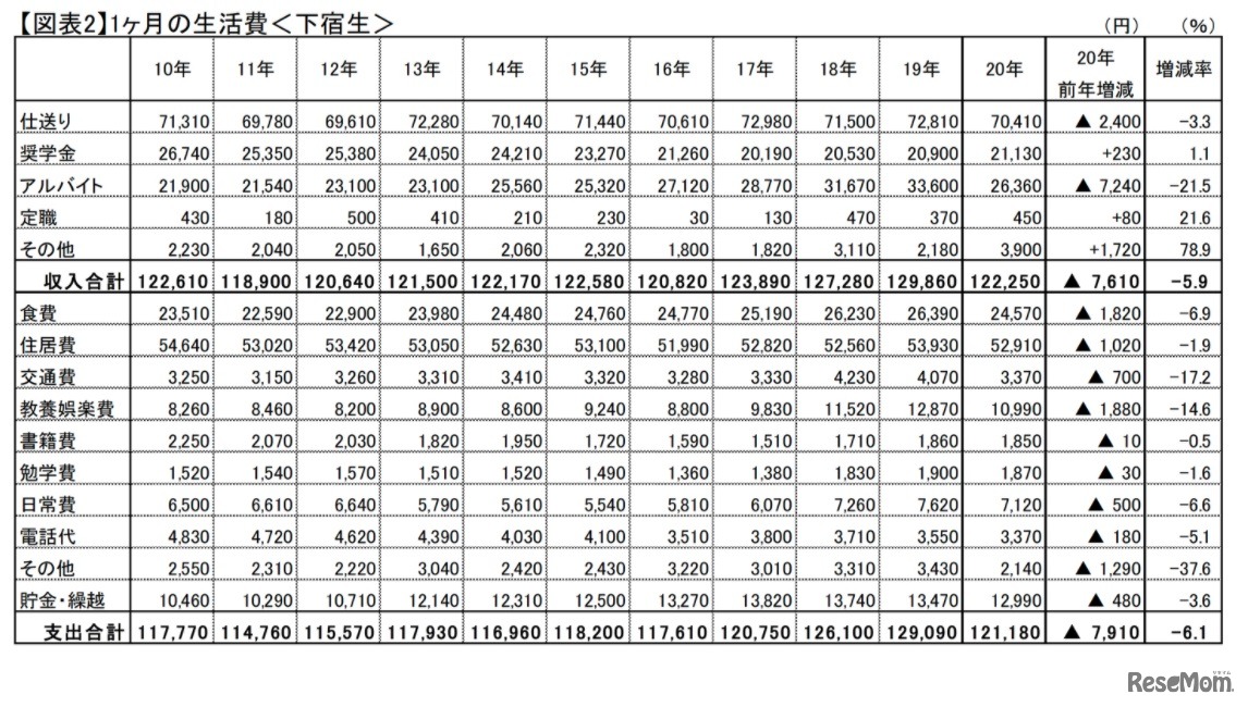 画像出典:全国大学生活協同組合連合会 1か月の生活費(下宿生)