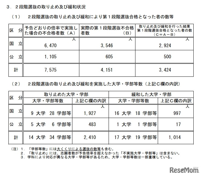 文部科学省は2021年3月10日、国公立大学入学者選抜(中期・後期日程)の2段階選抜実施状況を発表した。2段階選抜は25大学33学部で実施し、4,151人が不合格となった。