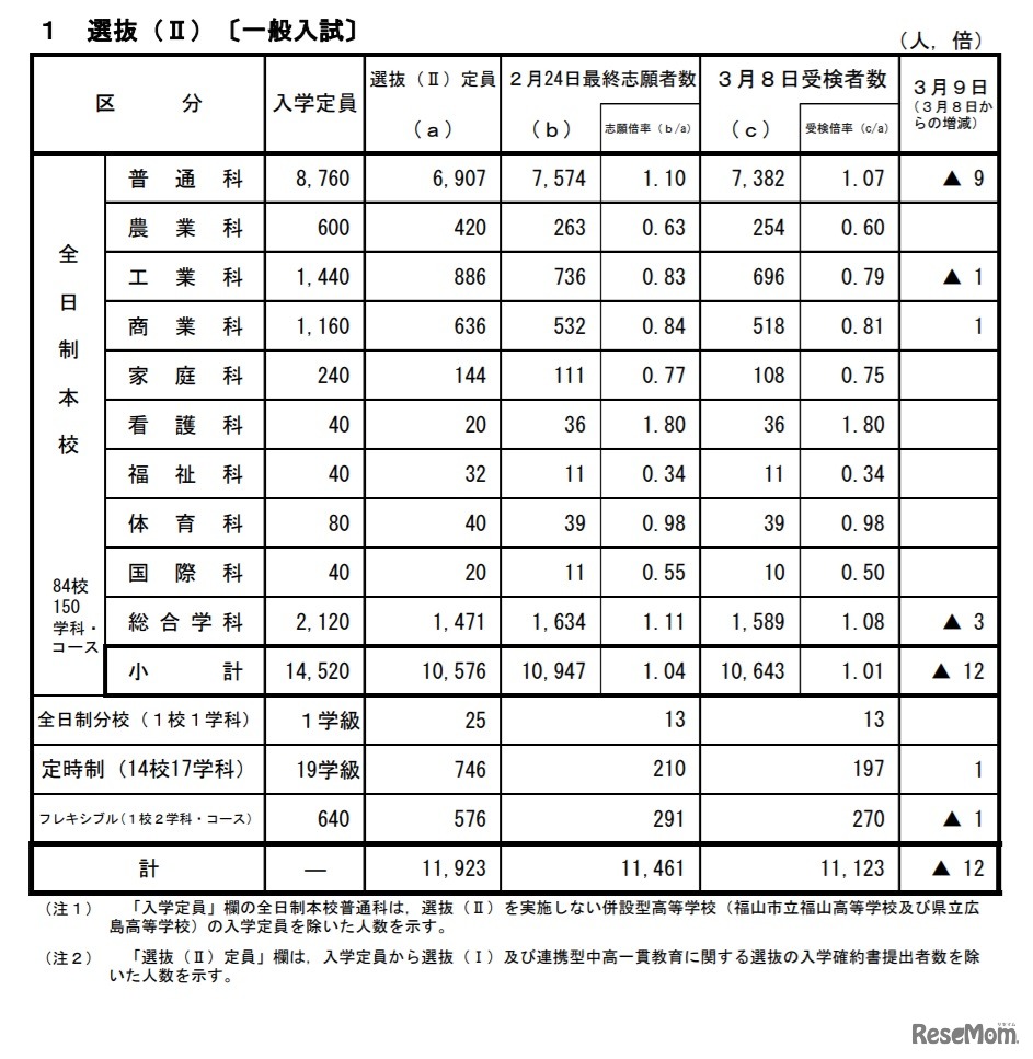 広島県教育委員会は、令和3年度(2021年度)広島県公立高等学校選抜(II)、帰国生徒および外国人生徒等の特別入学に関する選抜の受検状況を発表した。選抜(II)における受検倍率は広島市立基町(普通)1.18倍、広島市立舟入(普通)1.70倍など。