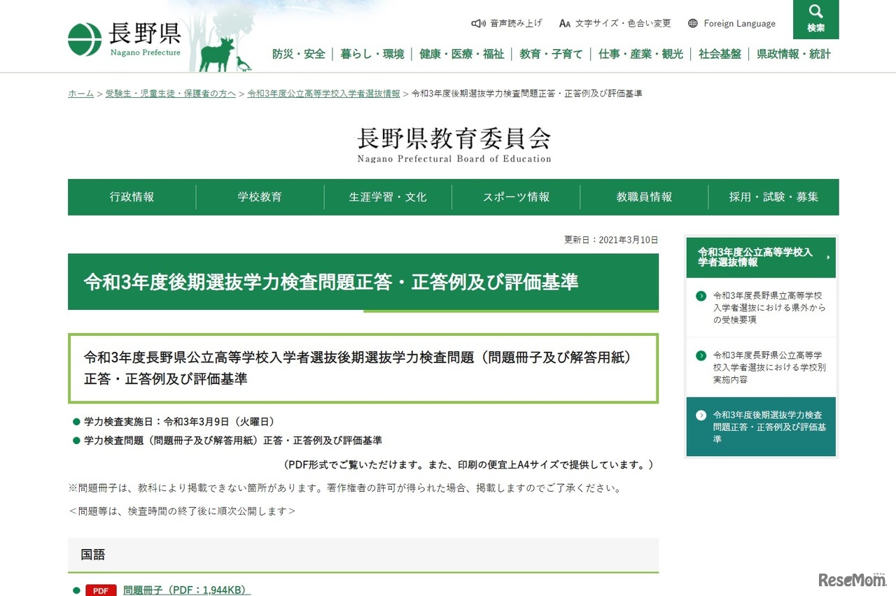 長野県教育委員会は2021年3月9日、令和3年度(2021年度)公立高等学校入学者後期選抜の学力検査問題の問題冊子と解答用紙、正答・正答例および評価基準を公開した。同日に受検状況も公表され、全日制課程の受検倍率は0.97倍だった。