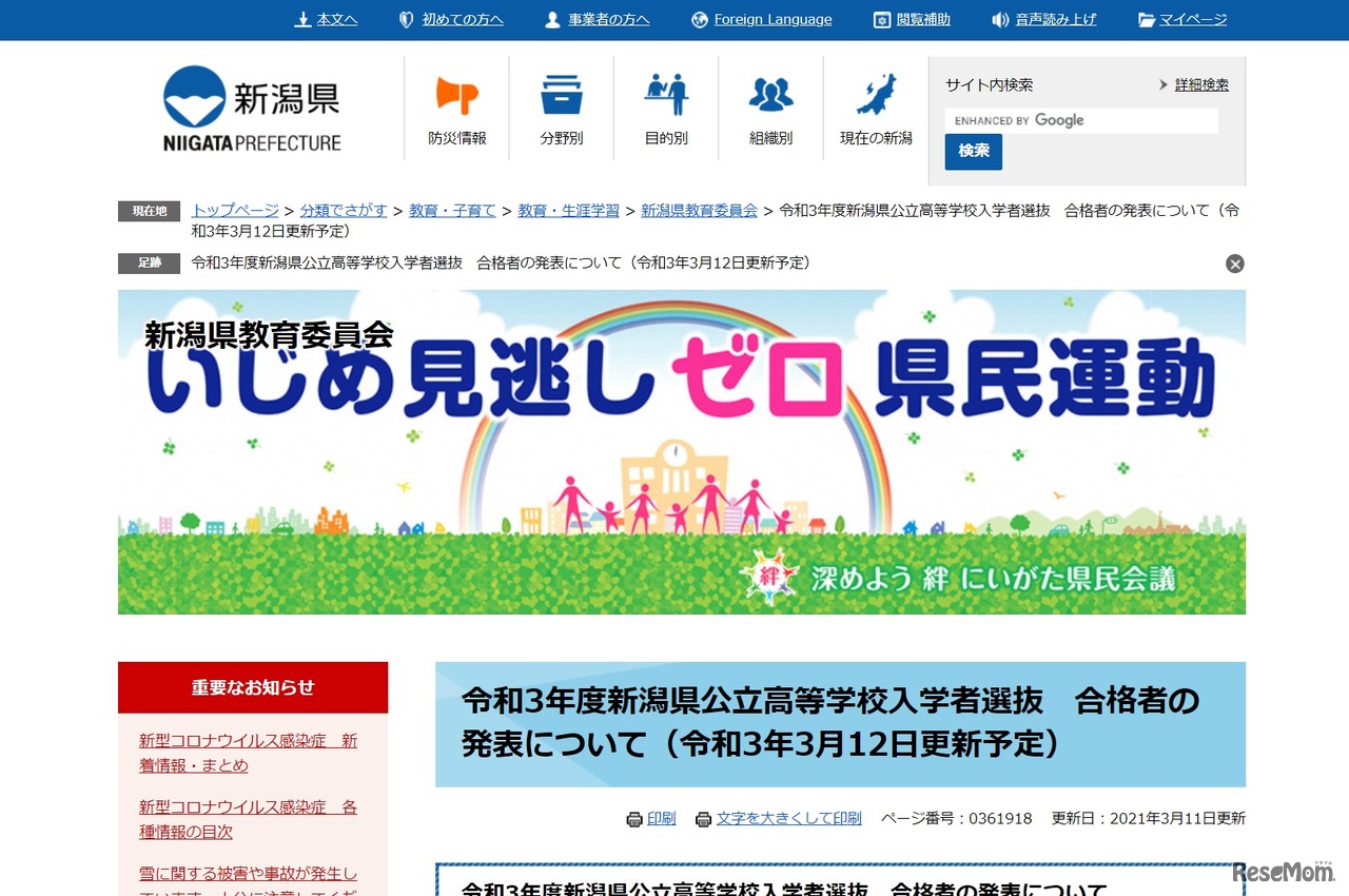 新潟県教育委員会は2021年3月12日午後0時30分より順次、令和3年度(2021年度)新潟県公立高等学校入学者選抜における各校の合格者発表を新潟県Webサイトにて掲載予定。公開期間は3月15日正午まで。