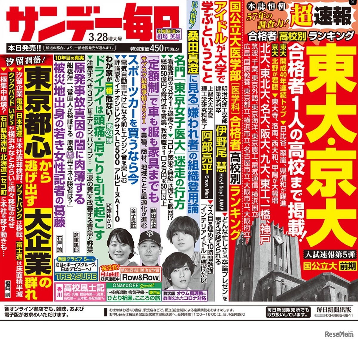 毎日新聞出版は、2021年3月12日に発売するサンデー毎日(3月28日号・450円)で「東大・京大合格者高校別ランキング」を掲載している。東京大学、京都大学の合格者を高校別にランキング形式で紹介。合格者1人の高校まで掲載している。