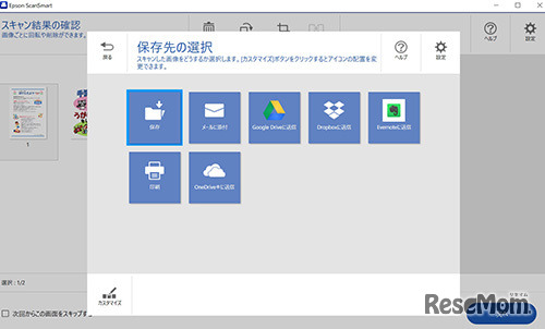 スキャンデータの保存先を選択。メールに添付したりクラウドに保存することも可能
